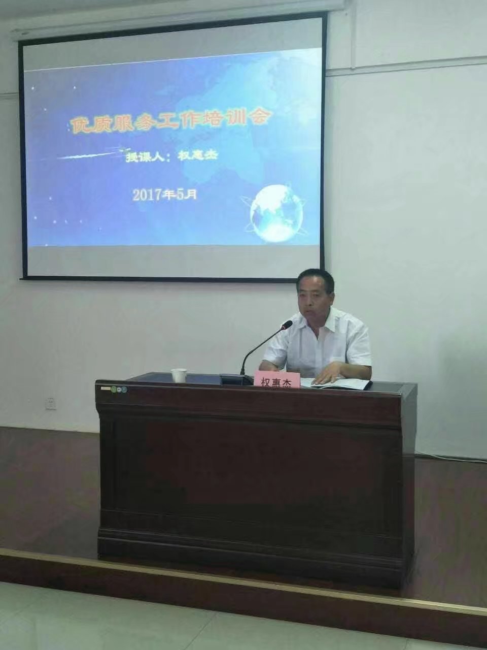隨著全面提升全員素質動員會議的召開,我公司2017年培訓工作正式拉開序幕。2017年5月12日上午,優(yōu)質服務專題培訓會議在我公司二樓召開,生產(chǎn)經(jīng)營部權惠杰主任授課。