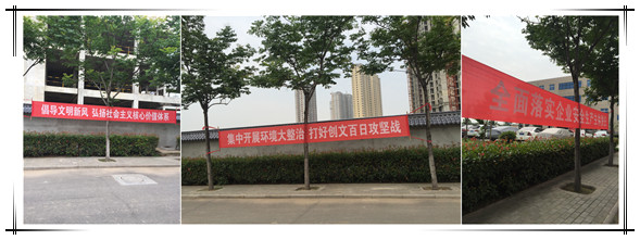 “倡導(dǎo)文明新風(fēng) 弘揚社會主義核心價值體系”、“集中開展環(huán)境大整治 打好創(chuàng)文百日攻堅戰(zhàn)”、“全面落實企業(yè)安全生產(chǎn)主體責(zé)任”,這些橫幅上的宣傳標語時刻提醒著我們要高度重視創(chuàng)文工作、安全生產(chǎn)工作。