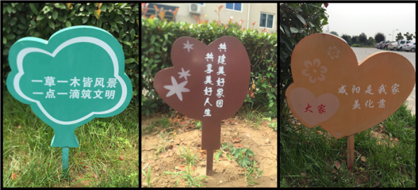 “一草一木皆風(fēng)景 一點一滴筑文明”、“共建美好家園 共享美好人生”、“咸陽是我家 美化靠大家”,這些草叢中并不起眼的宣傳牌顯得既平凡又偉大,我們都應(yīng)深刻體會這些語句的涵義,保護花草,踐行道德風(fēng)尚,共享文明成果。