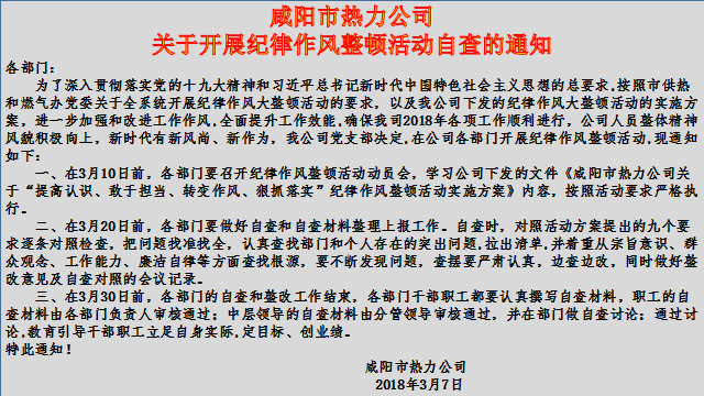 集體的提高離不開個人的進(jìn)步,人員的主觀能動性決定了集體的工作推進(jìn)和質(zhì)的飛越。我們公司各項(xiàng)工作能有序的開展,公司良好發(fā)展,正是因?yàn)楦鞑块T人員的鼎力合作。相信經(jīng)過紀(jì)律作風(fēng)整頓活動和這次調(diào)查問卷活動的深入開展,我公司干部職工都能認(rèn)清形勢,分清責(zé)任,增強(qiáng)黨性意識、規(guī)矩意識、擔(dān)當(dāng)意識、責(zé)任意識、發(fā)展意識和宗旨意識,努力塑造供熱人朝氣蓬勃、團(tuán)結(jié)協(xié)作、務(wù)實(shí)創(chuàng)新、廉潔高效的新形象,在各自崗位上認(rèn)真完成供熱優(yōu)質(zhì)服務(wù)工作,圓滿完成服務(wù)“零投訴”的年度目標(biāo)任務(wù)。在此我們也感謝多年來對我公司供熱工作支持的廣大熱用戶,是他們的信任和建議使我們不斷進(jìn)步、成長。